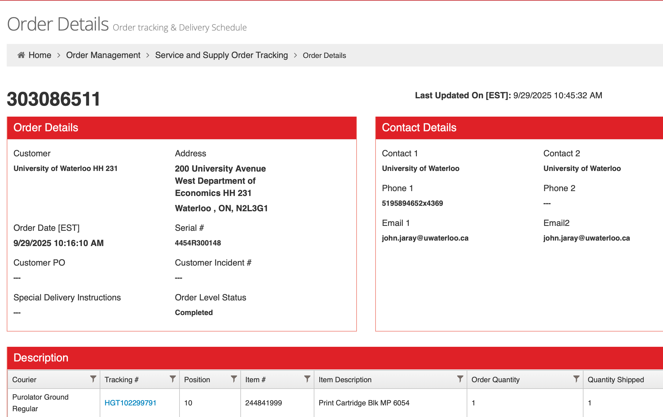 You should see it in your department’s MyRicoh account under Service and Supply Order Tracking.