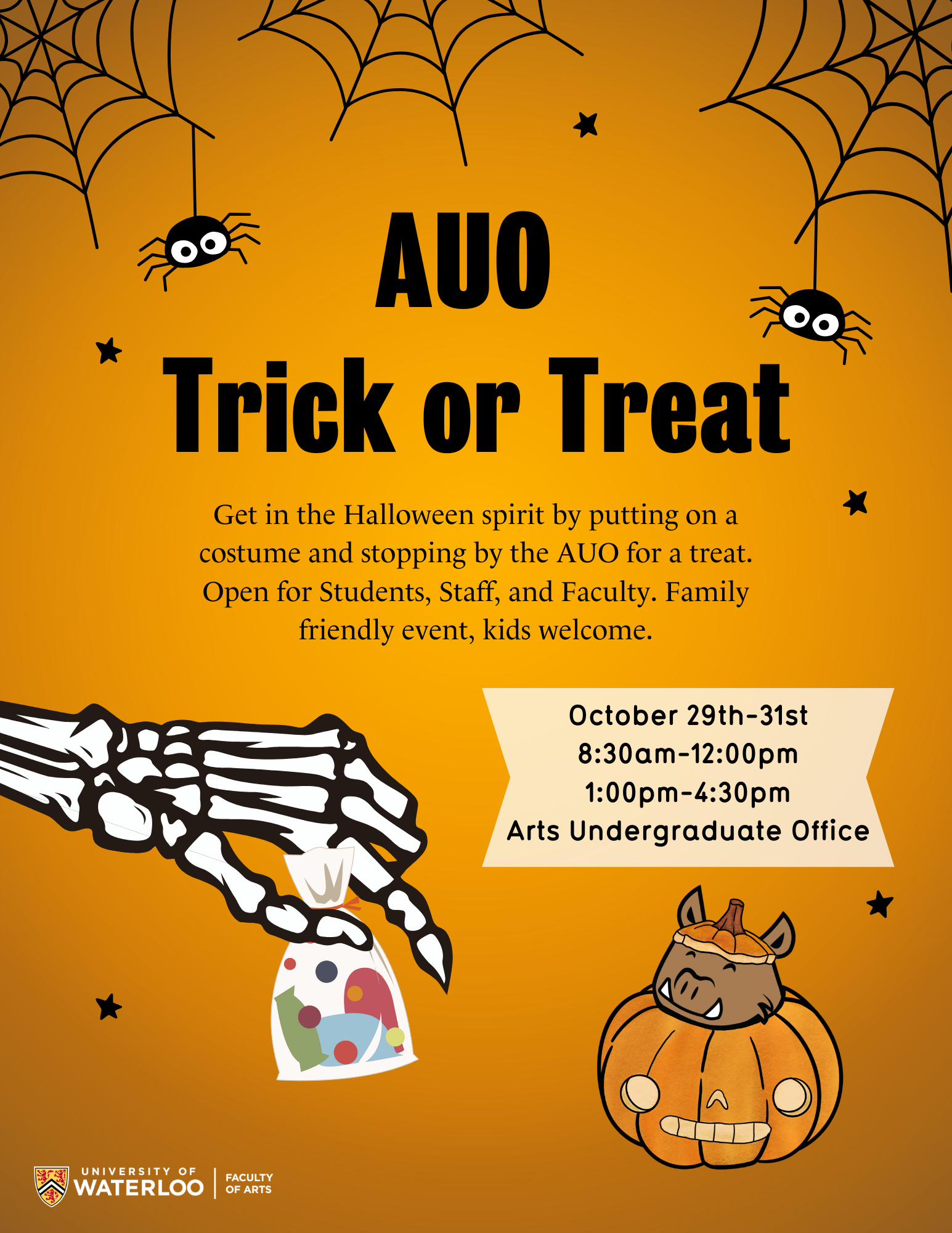 Get ready to dress to possess! We’re excited to invite you to our trick-or-treat event at the Arts Undergraduate Office (AUO), where we'll be handing out goodies and treats to all who stop by. Our office will be wearing our fa-BOO-lous costumes on Wed Oct 29th but you can come by Oct 29th, Oct 30th or Oct 31st for some frightfully good treats!