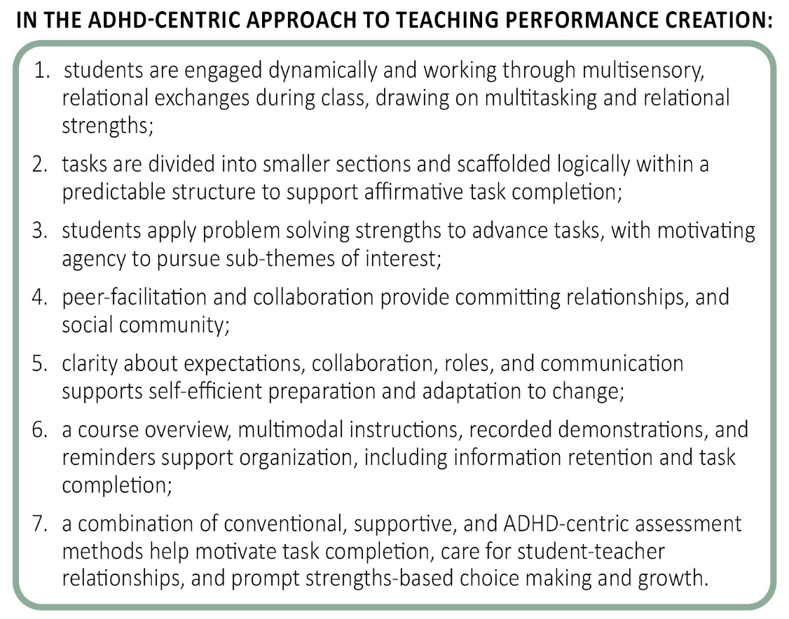 Uni/conservatory programs in the performing arts attract students with attention differences, but the field lacks educational tools to centre these students' abilities and provide meaningful support. A team of dance, theatre, and edu psych researchers in Canada developed the practical strategies shared here to draw out the strengths of adult students with ADHD in ways that reduce barriers and build capacity. The approach is transferable to in-person courses and adaptable to experiential learning in other disciplines. We invite performing arts instructors to share with peers for inspiration, try out our strategies, and join us in bringing about positive change.